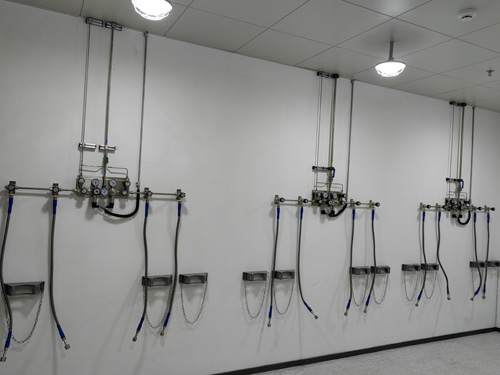 8.氣瓶間內的其他氣體氧氣瓶與壓調器中間使用SS316L負擔變壓器塑料橡膠管相聯接無構建。負擔變壓器橡膠管為槽式橡膠管,以切實保障相聯接的便宜性。并自導衛生防護鋼纜,治療極端天氣問題下,氧氣瓶閥弄壞等現狀帶動的負擔變壓器“抽鞭”交通事故。壓調器與給水管的相聯接模式為雙環卡套。